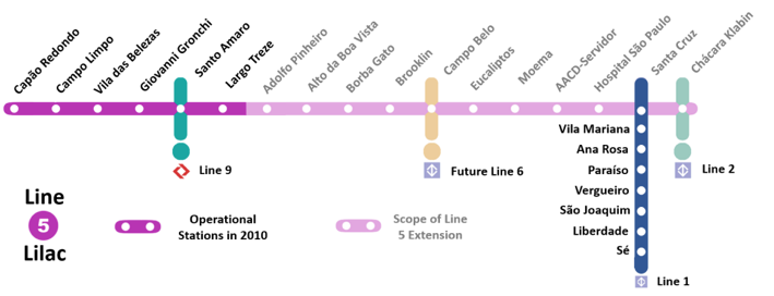 A intervenção incluiu obras civis, escavação de túneis, implantação de sistemas elétricos, telecomunicações, controle e sinalização, além da aquisição de 26 novos trens. A implementação foi estruturada em duas fases: a primeira, entre Adolfo Pinheiro e Água Espraiada, com quatro estações e mais de 1.200 metros de túneis, prevista para conclusão em 2010; e a segunda, entre Água Espraiada e Chácara Klabin, com seis novas estações, prevista para entrar em operação em 2012. Ao final, todas as estações da extensão estavam operacionais. O projeto buscou gerar mudanças estruturais no padrão de mobilidade urbana, ampliando a oferta de transporte coletivo de alta capacidade, reduzindo tempos de deslocamento e integrando definitivamente a Linha 5 às demais linhas do sistema metroferroviário, ilustrado na figura 2.